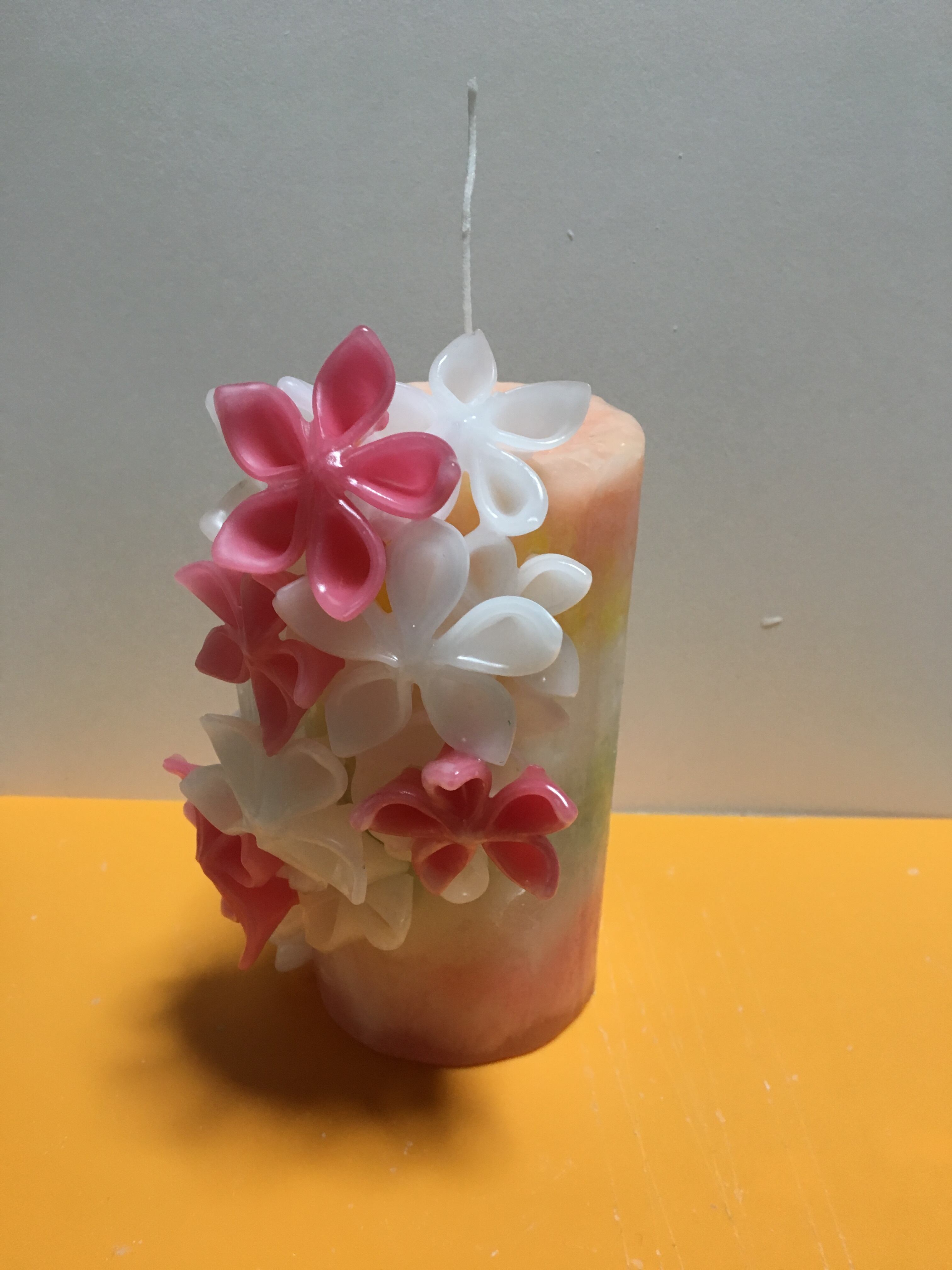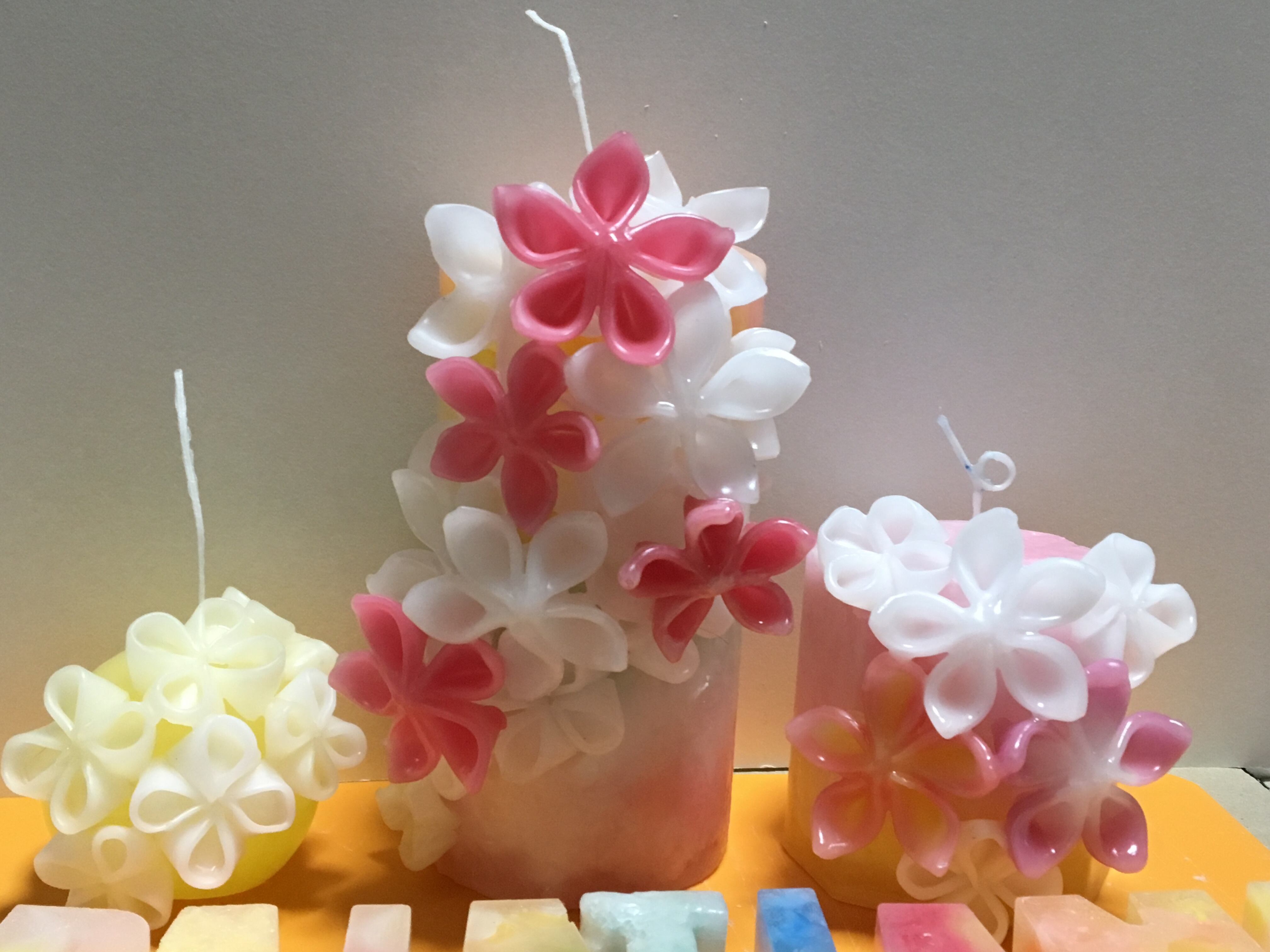 ハワイアンカラーのキャンドルチャンクキャンドルに赤いプルメリアとピカケのお花でハワイアンレイをイメージしました。